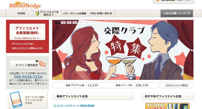 こちらの画面の左上の 『アフィリエイト会員登録(無料)』 から登録を開始いたします。