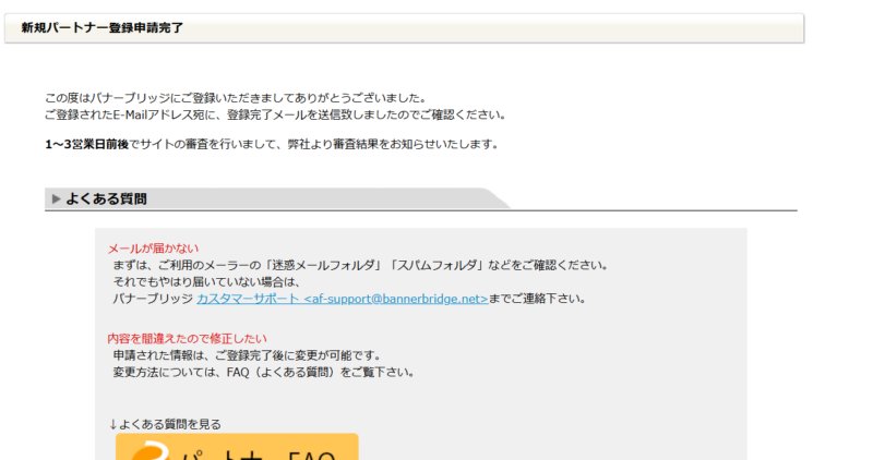 ③ 『新規パートナー登録申請完了』 下画像までいきますと1~3営業日前後で審査結果が登録したメールアドレス宛に届きます。